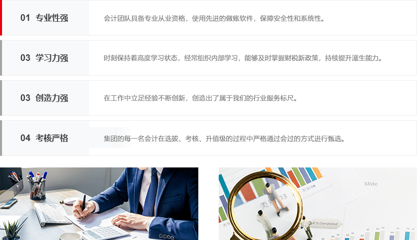 我的企業提供的財務服務,都是基于多年創新經驗總結出的科學流程和做賬標準,保證服務精細,數據精準、專業高效。
